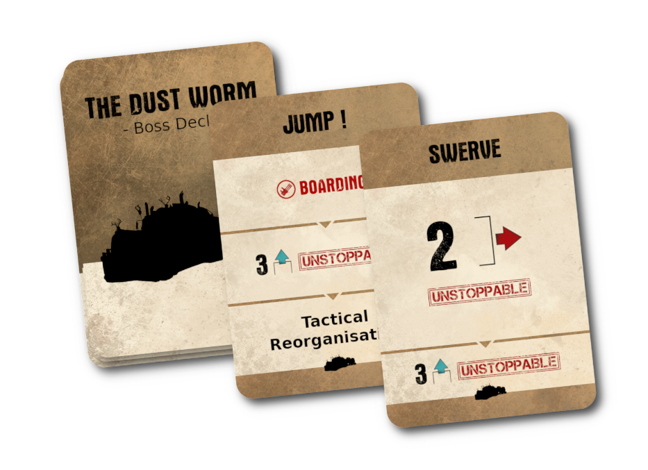There are 4 bosses in Dust Road, each one of them is controlled by a 8 cards deck. Each deck is different and each boss offers a new challenge.