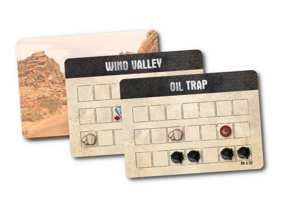 Dust Road is a cooperative board game in which players drive fast cars hunting down a convoy for spare parts.
